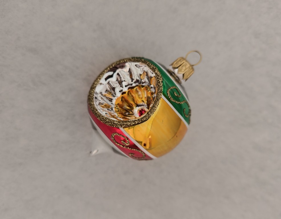 +420 731 683 257vanocniozdoby@slezska-tvorba.czSkleněná vánoční ozdoba ve tvaru cibule s tlačeným reflektorem, volně foukaný tvar, barevný dekor, lesk, velikost 6 cm, foto ilustrační