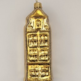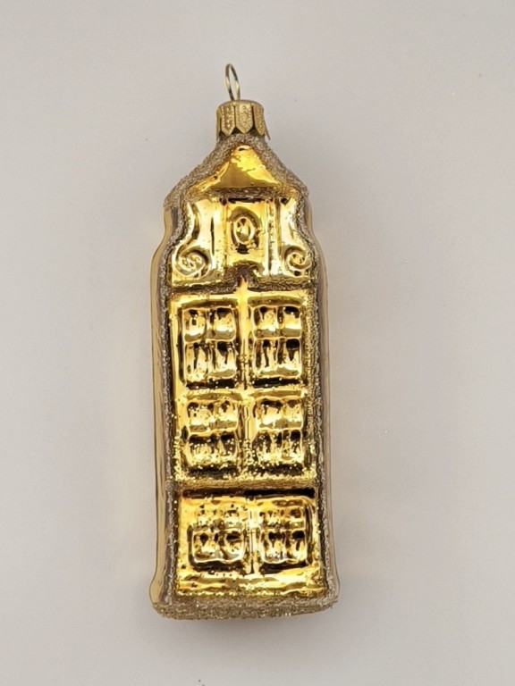 Skleněná vánoční ozdoba, dům historický střední, forma, zlatý lesk/283, foto ilustrační. Velikost 10 cm.
