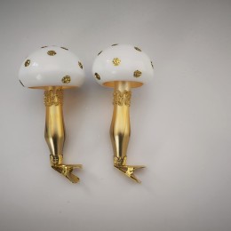 Skleněná vánoční ozdoba, volně foukaný tvar, houba kulatý klobouk/5 cm bílozlatá, lesk/mat,velikost 9 cm. Foto ilustrační. Tvar skřipce (kaplík nebo kónická pružinka) a jeho barva (zlatá nebo stříbrná) dle skladových zásob.