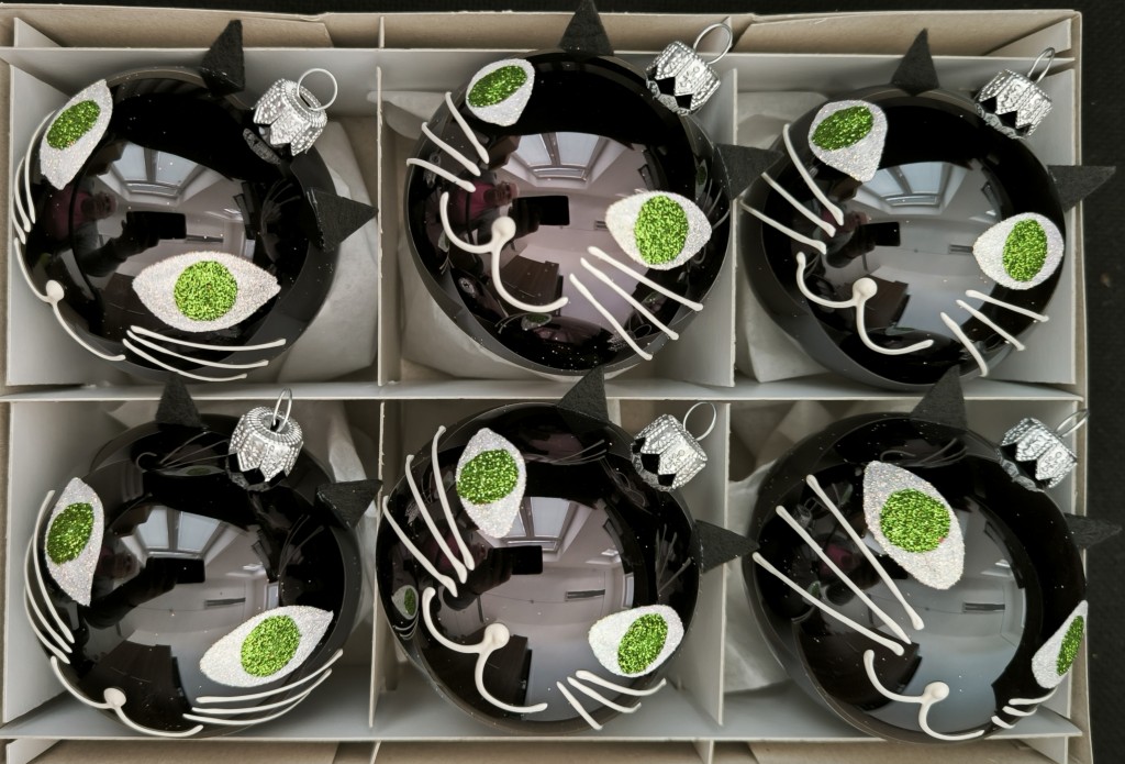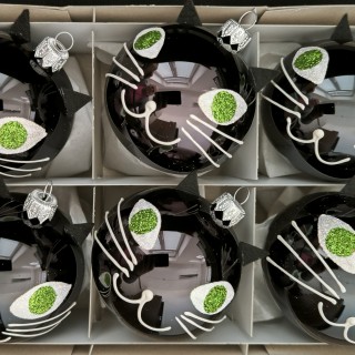 Skleněná ozdoba ve tvaru koule, hladká, černá, lesk, malovaný dekor, motiv kočky, foto ilustrační, velikost 7 cm.