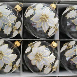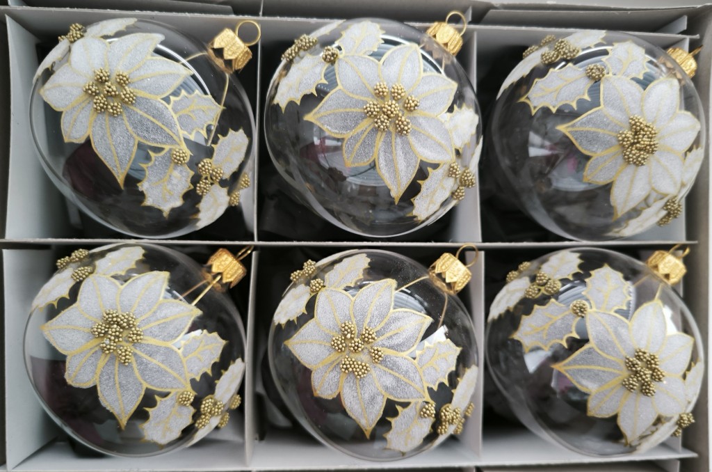 Skleněná vánoční ozdoba ve tvaru koule, hladká, čirá, lesk, středem koule bohatý bílo-zlatý květ, více velikostí. Foto ilustrační