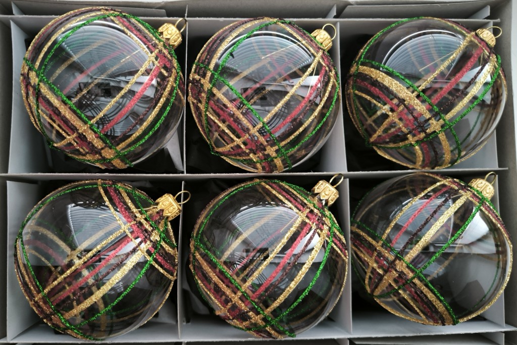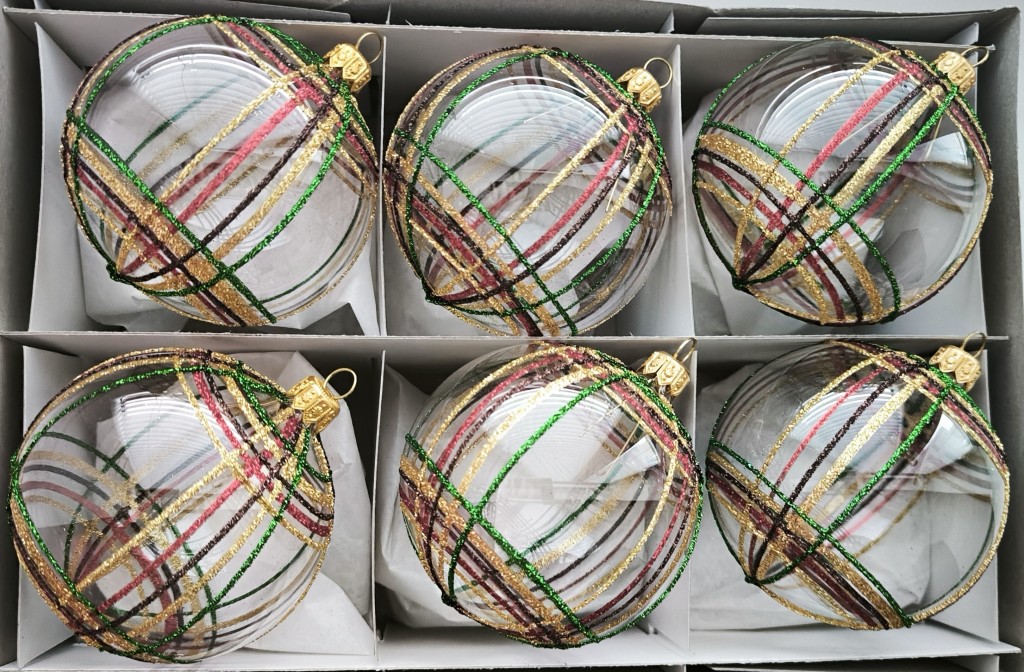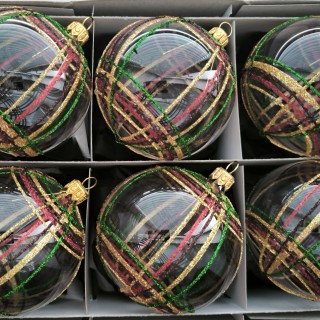 Skleněná vánoční ozdoba ve tvaru koule, hladká, čirá, lesk, dekor barevné káro, více velikostí. Foto ilustrační.