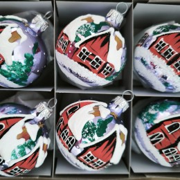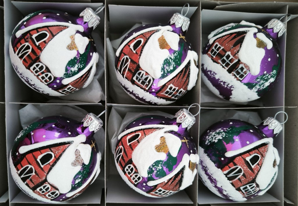 Skleněná vánoční ozdoba ve tvaru koule, fialová, lesk, tmavá a světlá varianta, ručně malovaný plastický zimní dekor s domky. Foto ilustrační