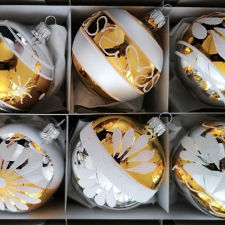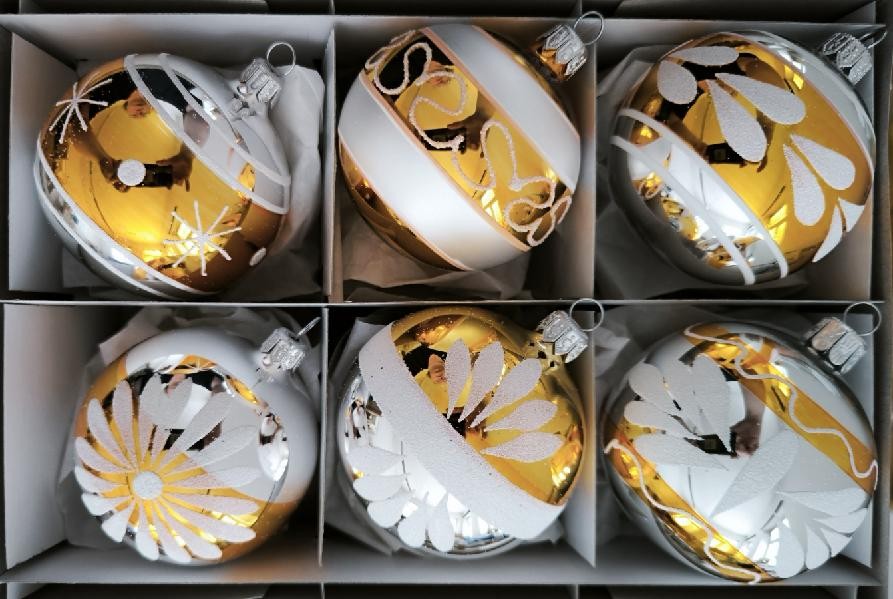 Skleněná vánoční ozdoba, koule, hladká, sortiment, kombinace 6 retro vzorů v 1 barvě (1121T034, 1121T035, 1121T036, 1121T037, 1121T031, 1121T042), velikost 7 cm. Foto ilustrační