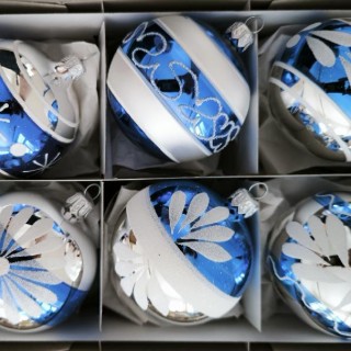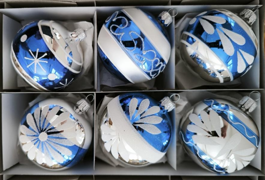 Skleněná vánoční ozdoba, koule, hladká, sortiment, kombinace 6 retro vzorů v 1 barvě (1121T034, 1121T035, 1121T036, 1121T037, 1121T031, 1121T042), velikost 7 cm. Foto ilustrační