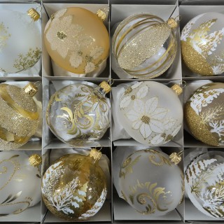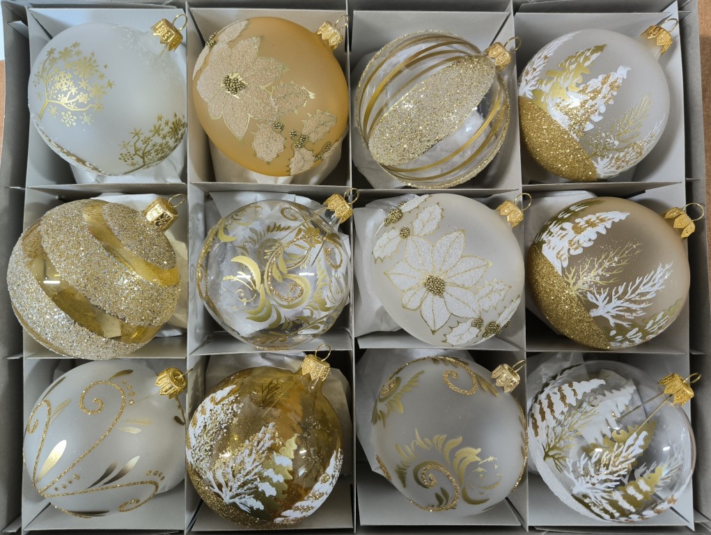 Sada/sortiment skleněných koulí, kombinace zlatých dekorů dle skladových zásob, velikost koule 8 cm. Foto ilustrační.