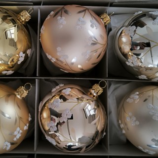 Skleněná vánoční ozdoba ve tvaru koule/sortiment, hladká, ass barev, lesk/mat, po celé kouli malovaný větvičkový dekor, více velikostí. Foto ilustrační
