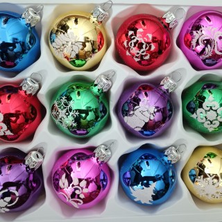 Skleněná vánoční ozdoba ve tvaru koule, hladká, sortiment, barva, varianty bílých dekorů, velikost 5 cm. Foto ilustrační.