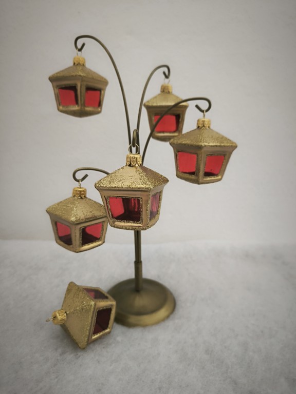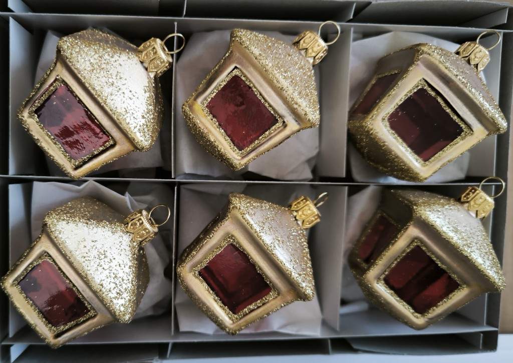 Skleněná vánoční ozdoba, forma, lucerna hranatá, zlatá, červené sklo, lesk/mat, dekor, velikost 5,5x5 cm. Foto ilustrační