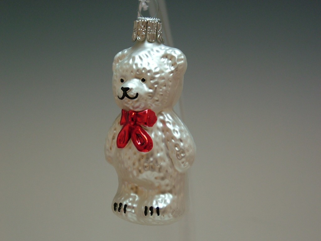 Skleněná vánoční ozdoba, forma, medvěd s červenou mašlí, malý, bílý, mat, dekor. Foto ilustrační