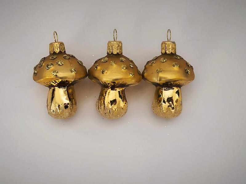 Skleněná foukaná vánoční ozdoba, muchomůrka zlatá menší, klobouček zlatý mat se zlatými puntíky, lesk/mat, forma, foto ilustrační.