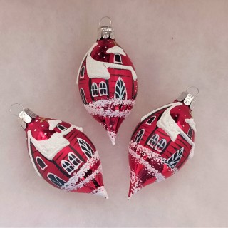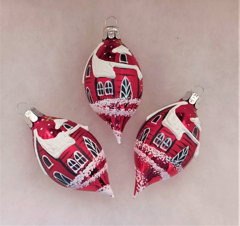Skleněná vánoční ozdoba, oliva, červená, lesk, ručně malovaný plastický dekor, zimní motiv. Foto ilustrační. Velikost 8 x 4 cm.