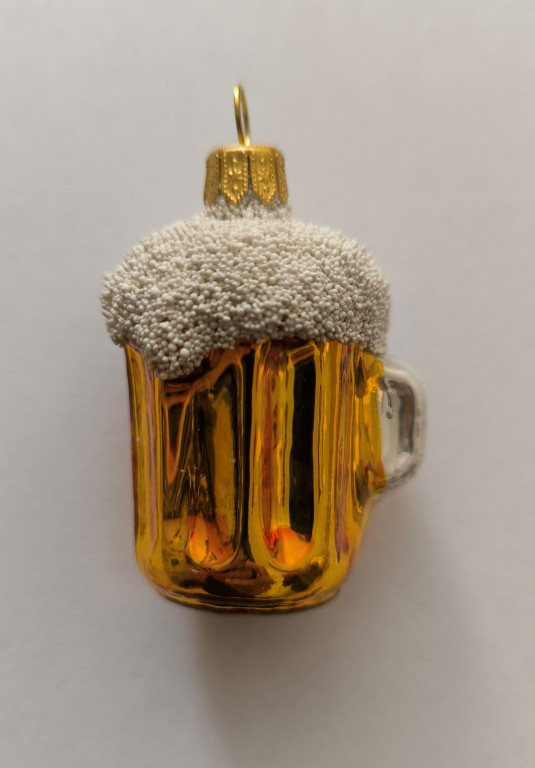 Skleněná ozdoba, forma, pivo, lesk/mat, velikost 6 cm. Foto ilustrační, dekor a barva ass, na figurce se může lišit