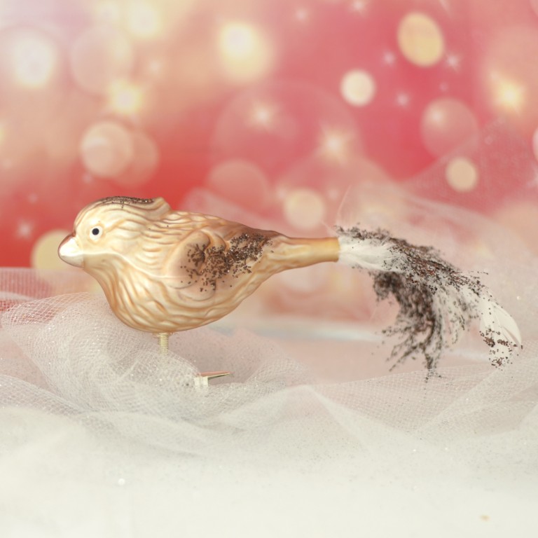 Skleněná vánoční ozdoba, forma, ptáček chocholka, stříkaný, dekor ass, hnědý, mat. Foto ilustrační
