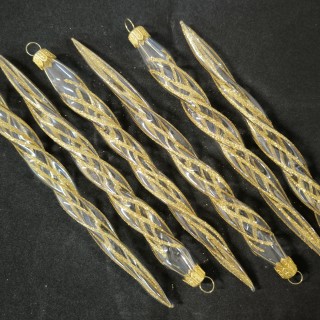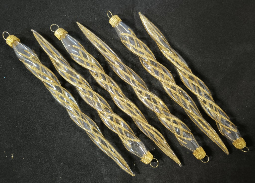 Skleněná vánoční ozdoba, volně foukaný tvar, rampouch hubený kroucený, čirý, zlatý dekor/9221/linky, velikost 20x1,5 cm. Foto ilustrační