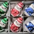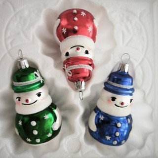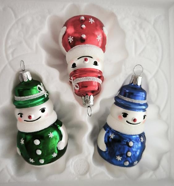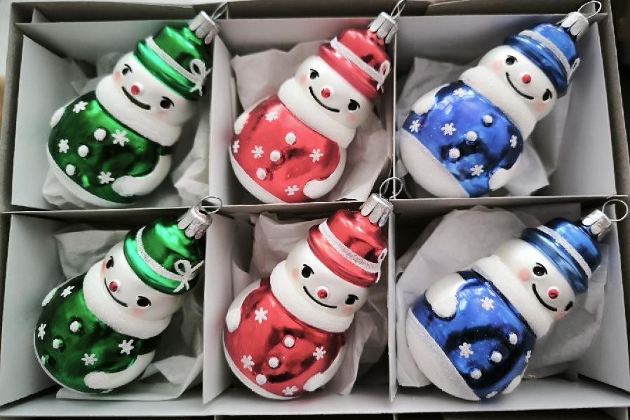 Skleněná vánoční ozdoba, forma, sněhulák malý, bílý, mat, barevný dekor s hvězdami (červený, zelený a modrý), velikost 8x4,3 cm. Foto ilustrační.