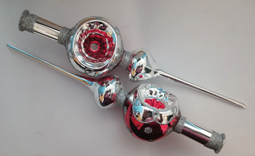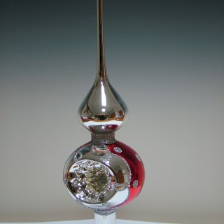 Skleněná vánoční ozdoba  ve tvaru špice, 1-kulová, stříbrná, hladká věžička, lesk, stříbrno-červená, na kouli 1x tlačený reflektor, velikost koule 6 cm, foto ilustrační