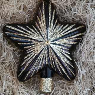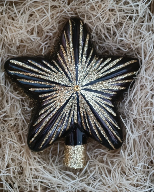 Skleněná vánoční ozdoba, špice hvězda, forma, černá, lesk, zlatý dekor v kombinaci se 2 šatony, velikost 13 x 15 cm. Baleno v dárkové krabičce/T1, Foto ilustrační