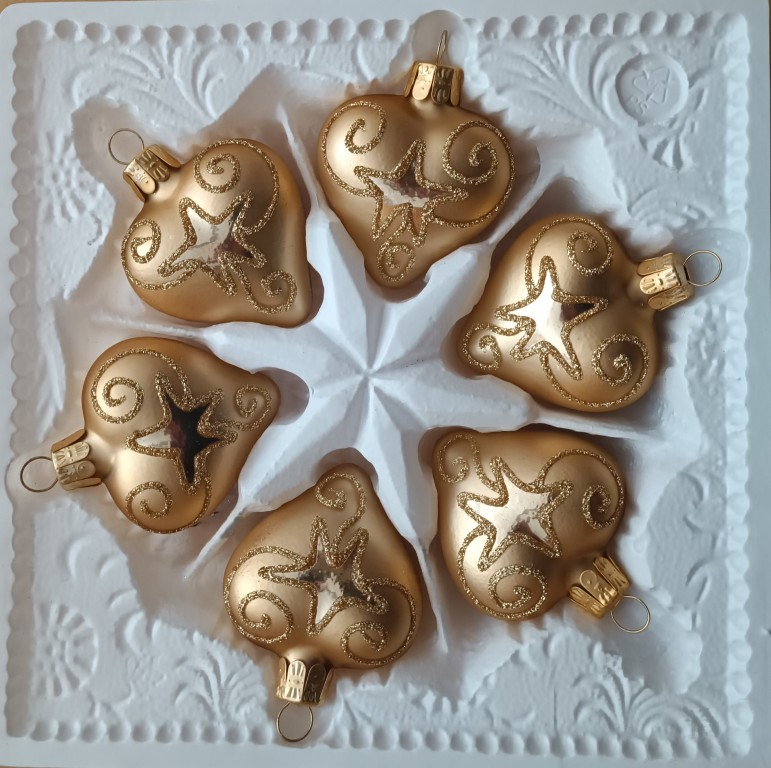 Skleněná vánoční ozdoba ve tvaru srdce, forma, hladké, zlaté, mat, plast. dekor, velikost 5,4x5,3 cm, foto ilustrační