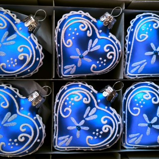 Skleněná vánoční ozdoba, srdce perník FREE, forma, plast. dekor, modrý mat, sypaný. Na přední straně plastický dekor. Zadní strana vánoční ozdoby je sypaná, modrý posyp. Foto ilustrační