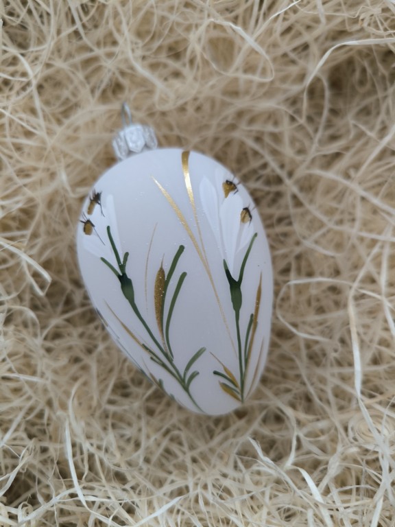 Skleněná ozdoba, vejce velikonoční, bílé, forma, ručně malovaný barevný dekor, 2 velikosti, foto ilustrační