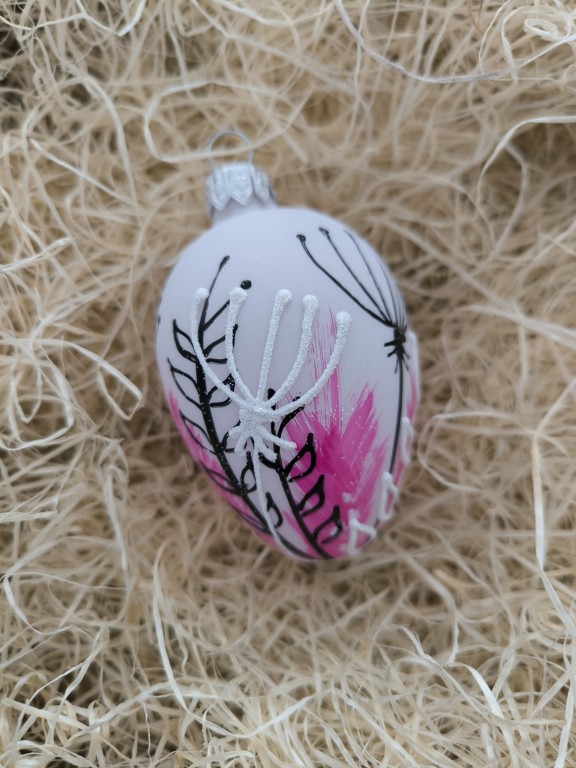 Skleněná ozdoba, vejce velikonoční, bílé, forma, ručně malovaný barevný dekor, 2 velikosti, foto ilustrační