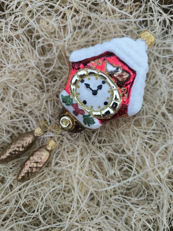 Skleněná ozdoba, hodiny s kukačkou menší, forma, barevný dekor. Velikost 8 cm. Baleno v dárkové krabičce/T1, Foto ilustrační. Limitovaná edice, omezený počet kusů.