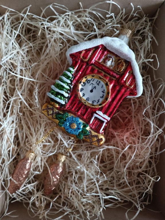 +420 731 683 257vanocniozdoby@slezska-tvorba.czSkleněná ozdoba, hodiny s kukačkou, forma, barevný dekor. Velikost 10 cm. Baleno v hnědé dárkové lepenkové krabičce/T1, Foto ilustrační. Limitovaná edice, omezený počet kusů.