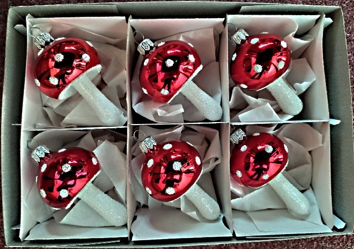+420 731 683 257vanocniozdoby@slezska-tvorba.czSkleněná vánoční ozdoba, volně foukaný tvar, houba muchomůrka malá, barevná, lesk, dekor, velikost 6x4 cm, foto ilustrační