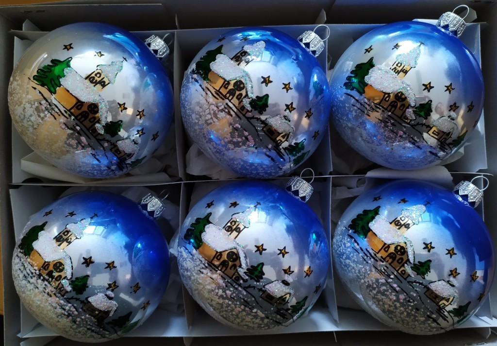 +420 731 683 257vanocniozdoby@slezska-tvorba.czSkleněná vánoční ozdoba ve tvaru koule, hladká, porcelán, modrý až modrofialový dekor, motiv vesnice s kostelem a stromy. Foto ilustrační