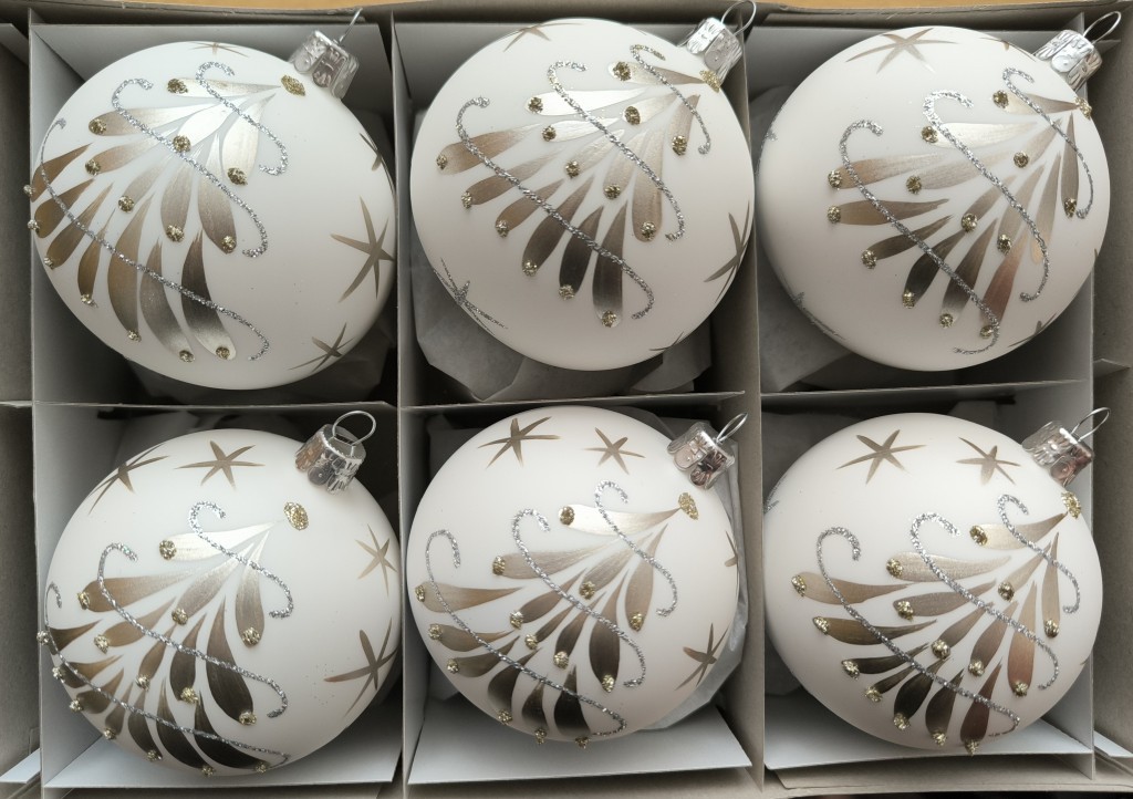 KOULE, SKLENĚNÁ, BÍLÁ SKOŘÁPKA, STŘÍBRNÝ DEKOR
