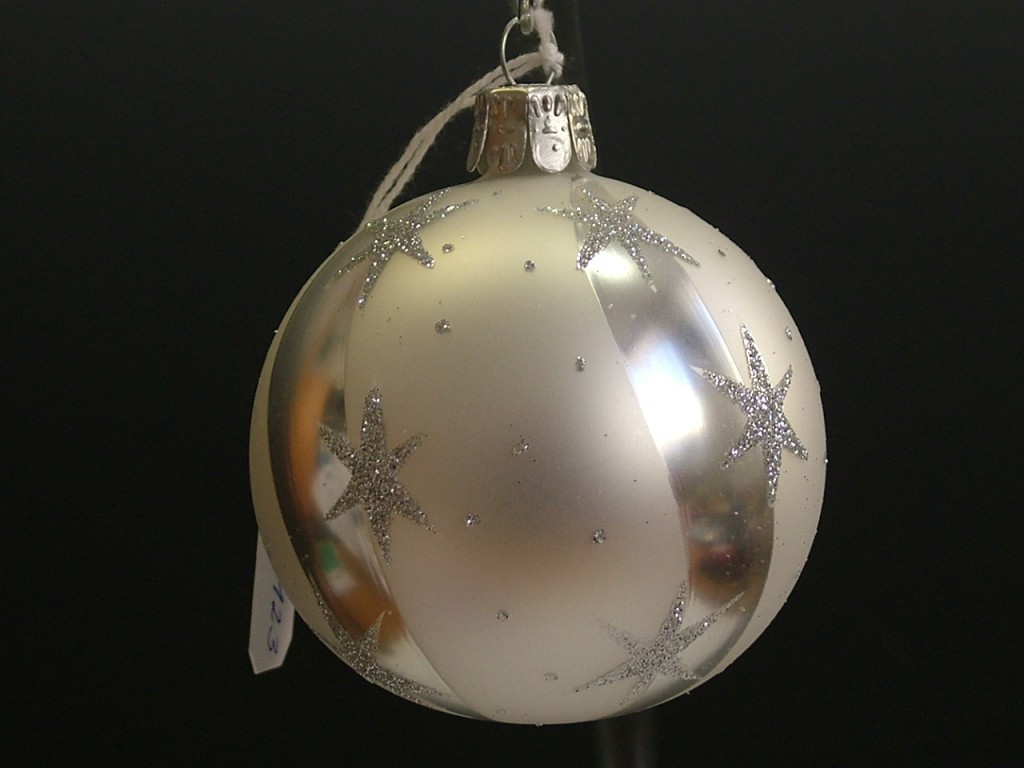 +420 731 683 257vanocniozdoby@slezska-tvorba.czSkleněná vánoční ozdoba ve tvaru koule, hladká, bílý mat, stříbrný dekor hvězd, více velikostí. Foto ilustrační