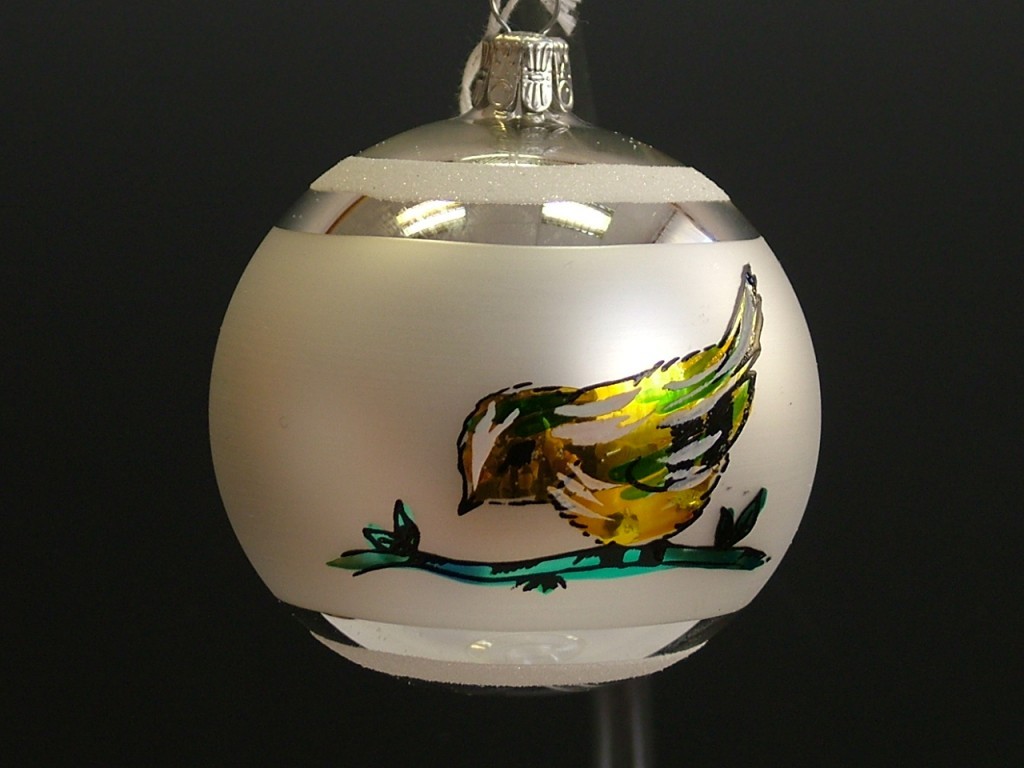 +420 731 683 257vanocniozdoby@slezska-tvorba.czSkleněná vánoční ozdoba ve tvaru koule, hladká, stříbrná, bílý mat, barevný dekor. Foto ilustrační