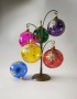 Skleněná vánoční ozdoba ve tvaru koule, hladká, lesk, barva ass, malovaný zlatý retro dekor, více velikostí. Foto ilustrační (sortiment barev: červená, modrá, žlutá, zelená, růžová, fialová)