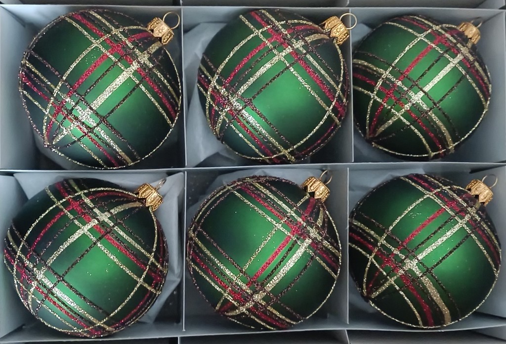 +420 731 683 257vanocniozdoby@slezska-tvorba.czSkleněná vánoční ozdoba ve tvaru koule, hladká, tm. zelená, mat, plast. dekor, červené káro, více velikostí. Foto ilustrační.