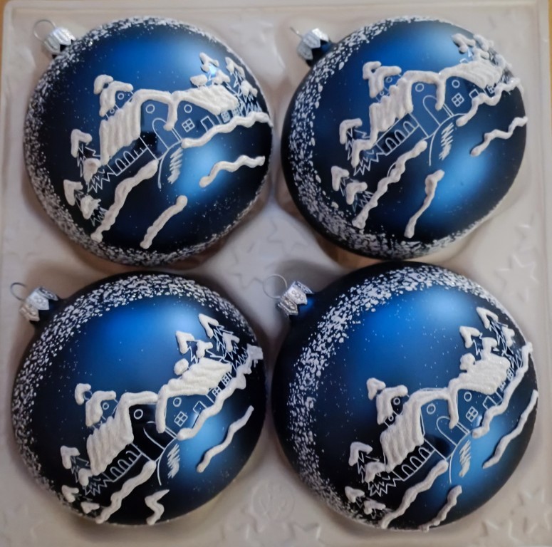 +420 731 683 257vanocniozdoby@slezska-tvorba.czSkleněná vánoční ozdoba, koule, hladká, tmavě modrá/874, mat, bílý plastický dekor, motiv vesničky, více velikostí, Foto ilustrační