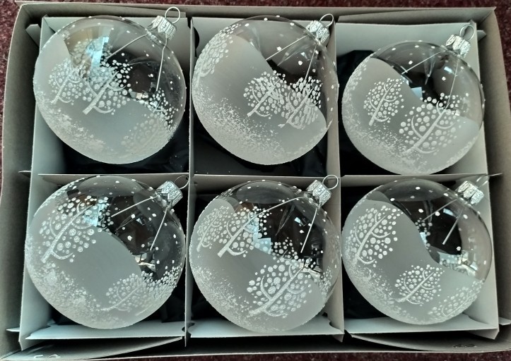 Detail produktuSkleněná vánoční ozdoba ve tvaru koule, hladká, čirá, lesk, bílý dekor stromů, více velikostí. Foto ilustrační