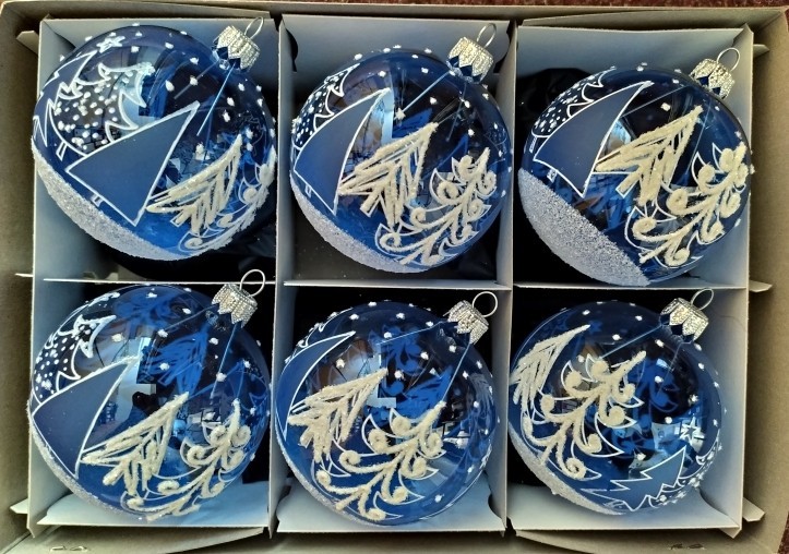 +420 731 683 257vanocniozdoby@slezska-tvorba.czSkleněná vánoční ozdoba ve tvaru koule, hladká, průhledná, modrá, lesk, bílý dekor stromů. Foto ilustrační.