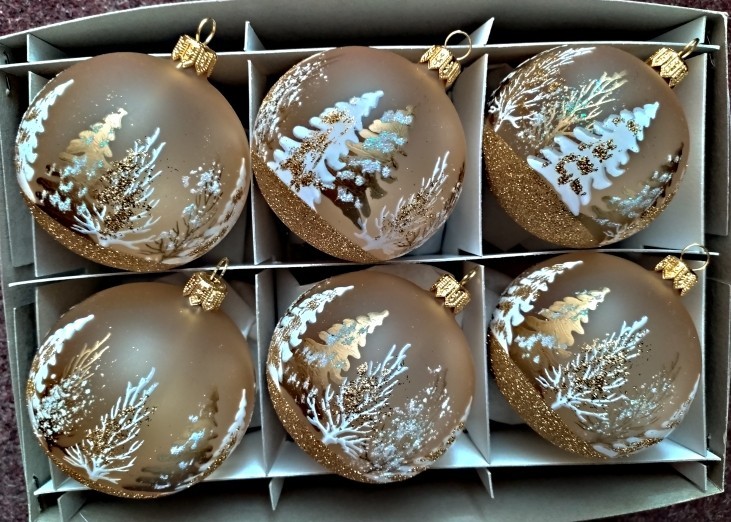 +420 731 683 257vanocniozdoby@slezska-tvorba.czSkleněná vánoční ozdoba ve tvaru koule, hladká, průhledná, zlatá mat, bílozlatý dekor stromů, více velikostí. Foto ilustrační
