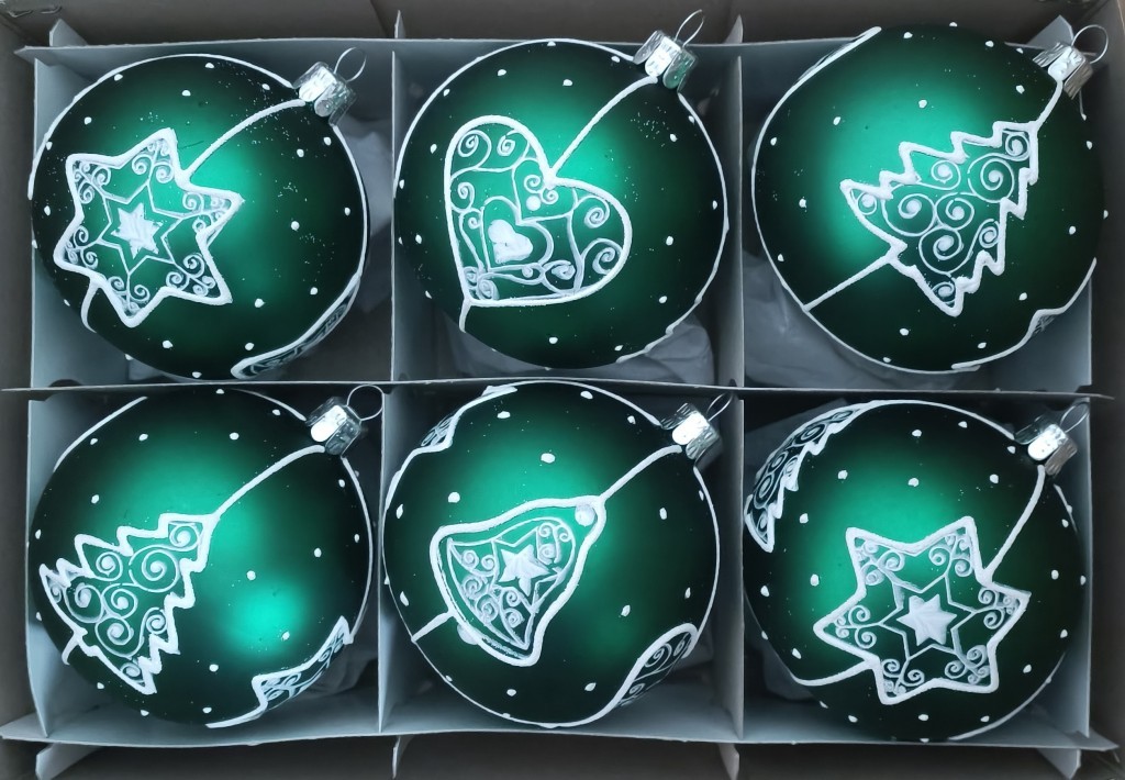 +420 731 683 257vanocniozdoby@slezska-tvorba.czSkleněná vánoční ozdoba ve tvaru koule, hladká, tm. zelená/734, mat, bílý plastický dekor, více velikostí. Foto ilustrační.