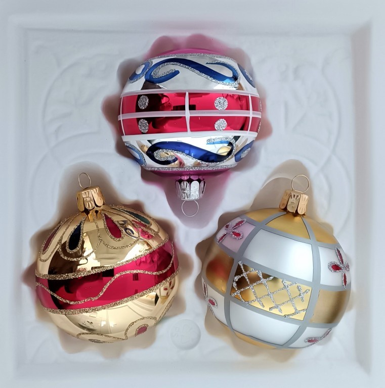 +420 731 683 257vanocniozdoby@slezska-tvorba.czSkleněná vánoční ozdoba ve tvaru koule, hladká, stříbřená, lesk/mat, barevná, malovaný dekor, sortiment (1x 1124T098 + 1x 1122T020 + 1x 1121T011), velikost koule 7 cm, foto ilustrační.