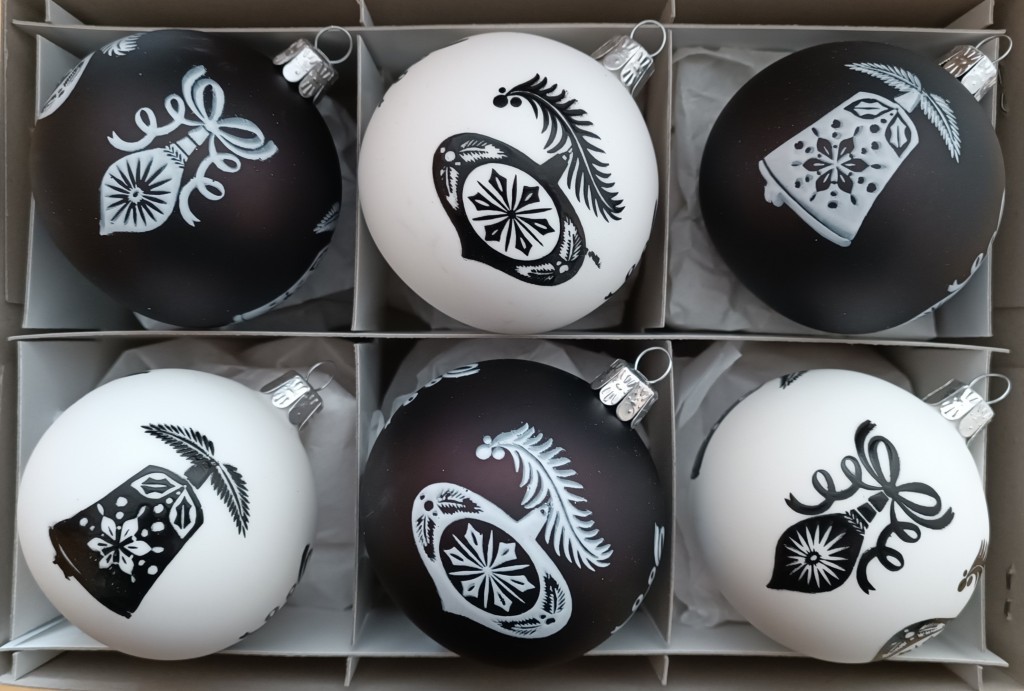 +420 731 683 257vanocniozdoby@slezska-tvorba.czSkleněná vánoční ozdoba, koule, hladká, sortiment, kombinace bílé a černé barvy, provedení 3x černý mat, 3x bílá skořápka, dekor, velikost 7 cm. Foto ilustrační
