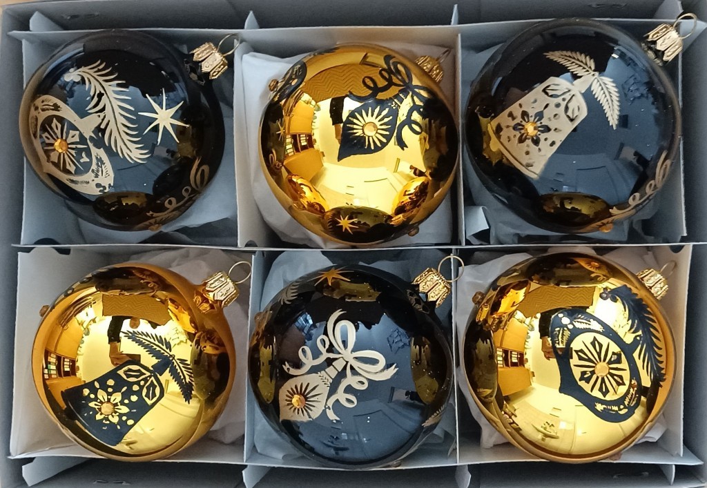 Skleněná vánoční ozdoba, koule, hladká, sortiment, kombinace černé a zlaté barvy, provedení 3x černý porcelán, 3x zlatý lesk, dekor, velikost 7 cm .