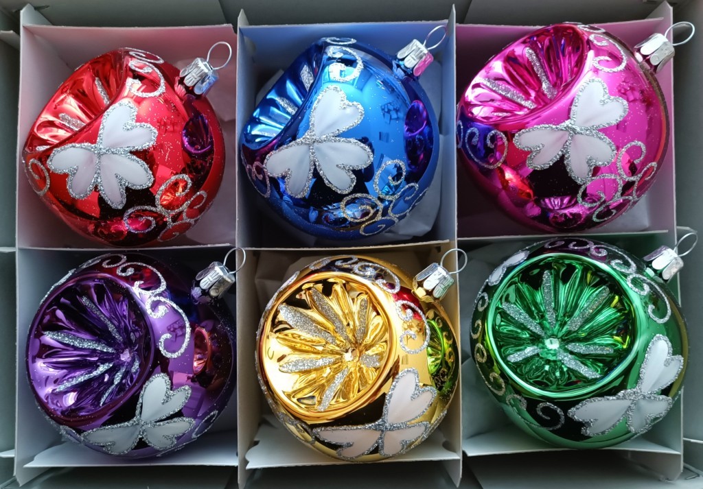 Detail produktuSkleněná vánoční ozdoba ve tvaru koule, 1x tlačený reflektor, barva ass, lak, dekor trojlístku, velikost 7 cm. Foto ilustrační.