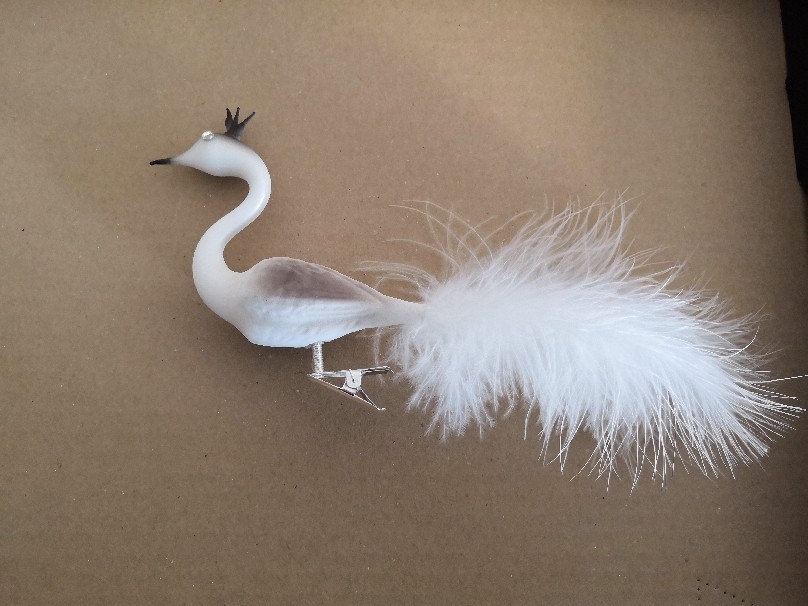 Skleněná vánoční ozdoba, forma, labuť malá s korunkou, bílošedý dekor, skořápka, šatony, s dlouhým bílým peřím, uvedená velikost bez peří, foto ilustrační