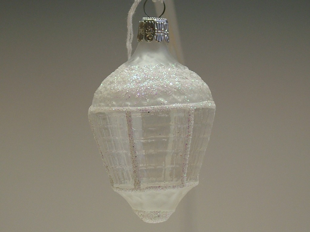 Detail produktuSkleněná vánoční ozdoba, forma, lucerna ovál, bílá, průhledná, mat, dekor, velikost 7x4,5 cm. Foto ilustrační