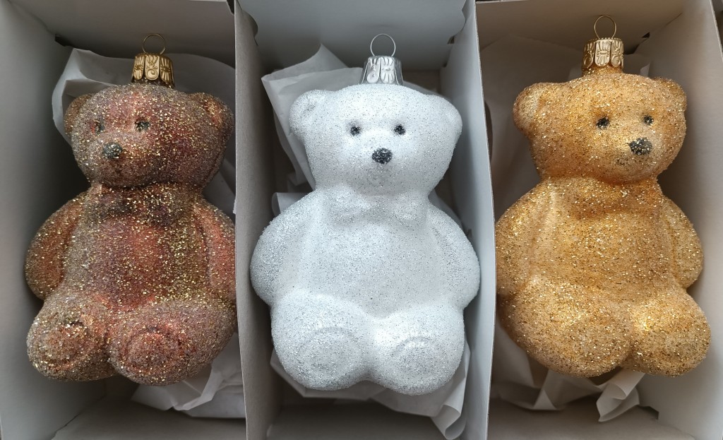+420 731 683 257vanocniozdoby@slezska-tvorba.czSkleněná vánoční ozdoba, forma, medvěd sedící s mašlí, velký, barevný dekor (zlatý, hnědý, bílý), velikost 10 cm. Foto ilustrační