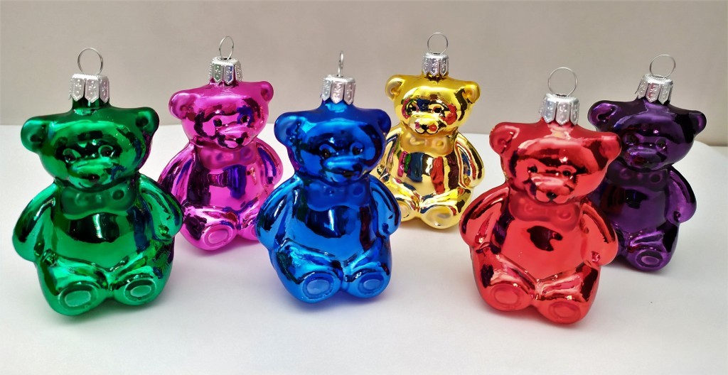 Detail produktuSkleněná vánoční ozdoba, forma, medvídek fmalý, lesk, barva ass, velikost 8x5,5 cm. Foto ilustrační. V krabici sortiment barev: červená, modrá, zlatá, zelená, růžová, fialová.
