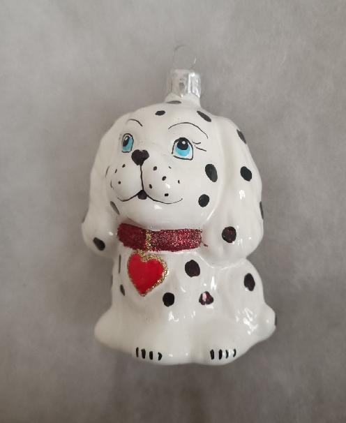 Detail produktuSkleněná vánoční ozdoba, forma, pes velký bílý, ručně malovaný dekor, lesk, foto ilustrační, velikost 10 cm.