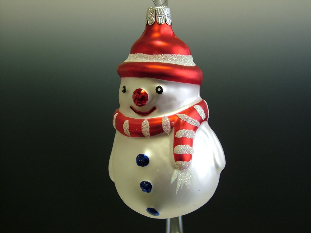 Detail produktuSkleněná vánoční ozdoba, forma, sněhulák velký, šála barevná, mat, bílý, dekor, velikost10x7 cm. Foto ilustrační